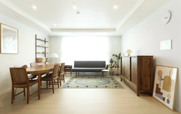 为了不让空间显得飘,特意用木质的餐桌和客厅柜压出重量感;又摆上画框、落地灯和绿植,平平淡淡的角落也有了生气。