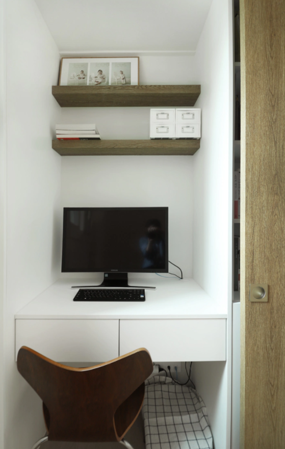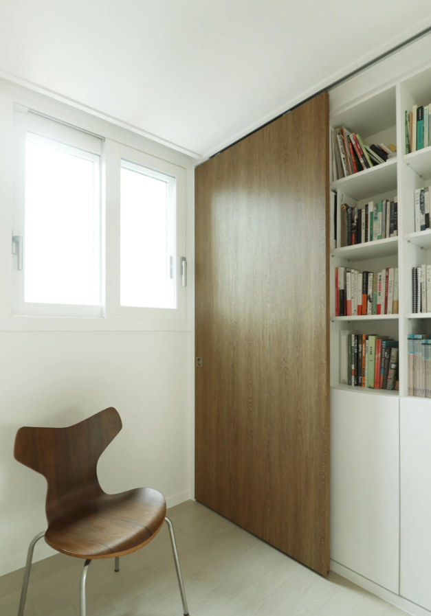 对面的书柜更有意思,装了木质移门,推开才发现,移门后藏着另一排书柜 —— 半开放半封闭的设计,想展示孩子的手工作品、家人的合影就敞开,怕落灰的书籍、杂物就关上,藏藏漏漏间,空间也省了不少。