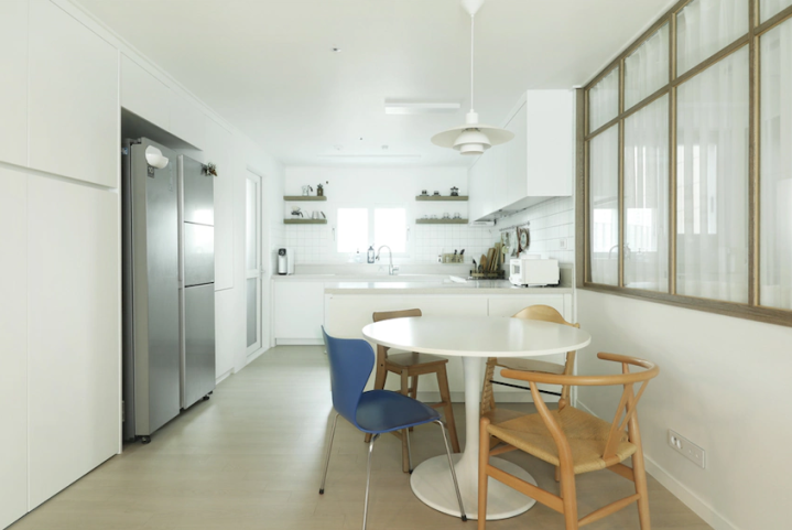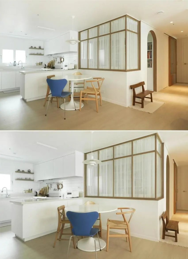 厨房角落摆了张圆桌,配着好看的椅子,成了个小 “家庭咖啡馆”,添了个功能区,也给日子加了不少乐趣。