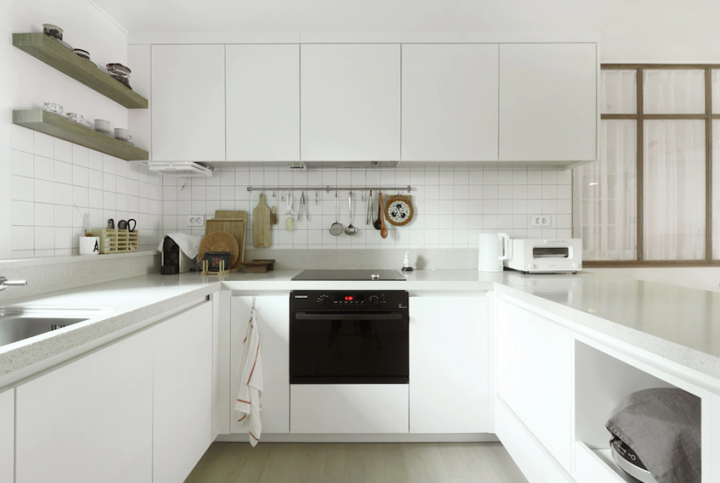 厨房的收纳也花了心思,白色吊柜搭着隔板一起用,该藏的藏、该摆的摆,拿取东西顺手得很。