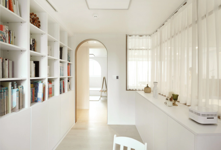 书房入口的拱门很是惹眼,边框用原木色包了边,一层叠一层,层次感一下子就出来了。书房一侧装了高低柜,不只是置物的地儿,还做了卡座设计,坐这儿看书、歇脚都自在,实用性拉满。