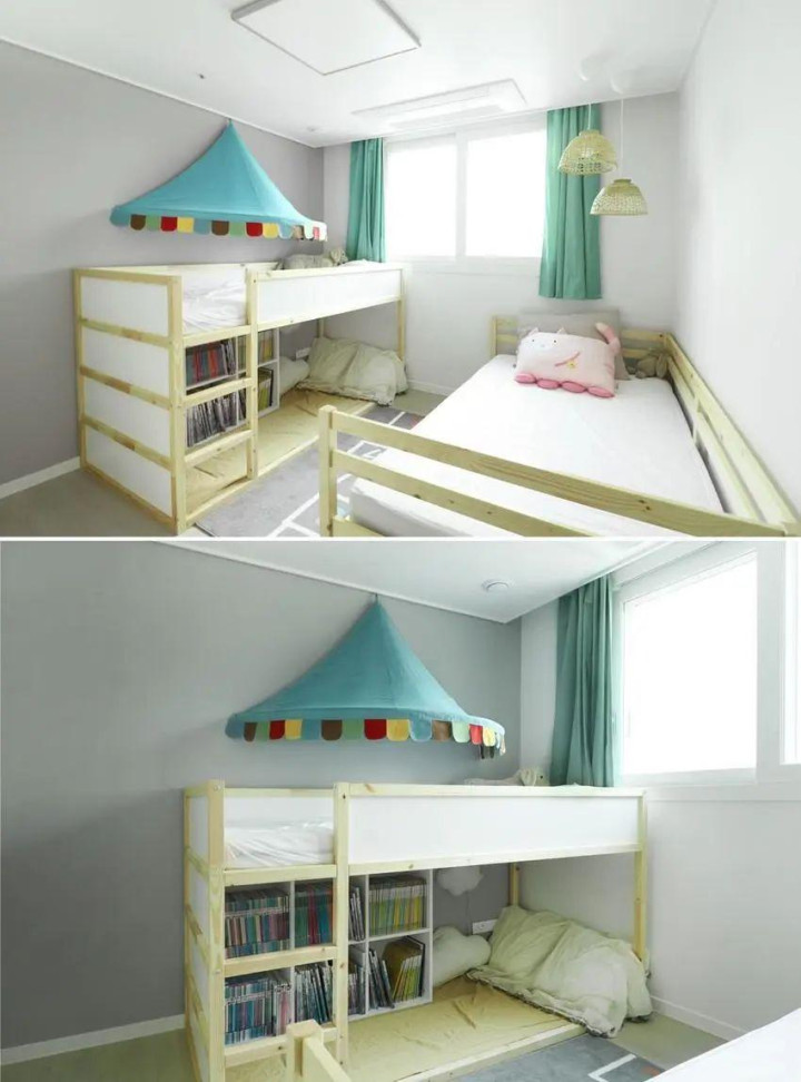 两个孩子还小,目前同住一间房,彼此有个伴。屋里放了两张高低床,上铺睡觉,下铺改造成了收纳区和小休闲角,衣服、玩具能塞进去,孩子也能在这儿坐着看书、玩拼图,考虑得特别周到。