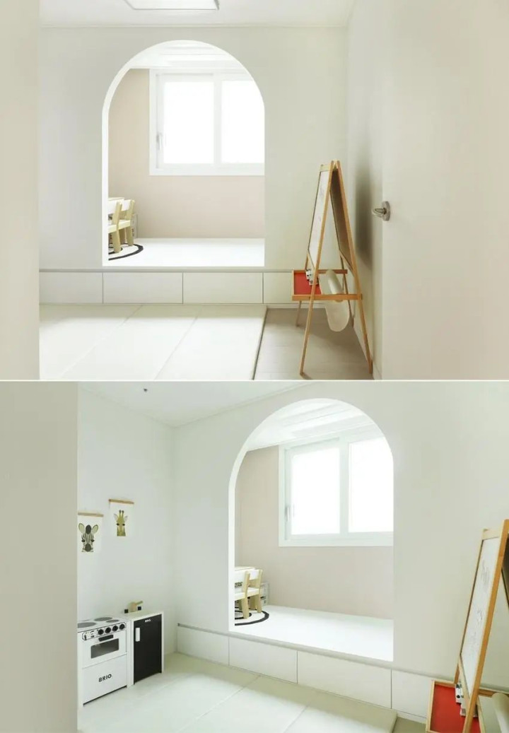 再往里走是孩子的娱乐房,打了地台做休闲区,还砌了假墙弄出个拱形门洞,弯弯的造型透着童趣,孩子在这儿跑跳、玩玩具,自在又开心。