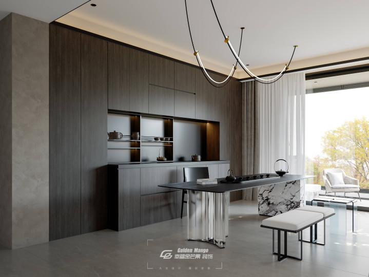 在空间的另一侧,一张意式风格的茶桌静静伫立。它以金属框架搭配大理石台面,展现出一种冷峻又不失柔和的美。这里是一个放慢脚步的地方,无论是清晨一杯茶,还是午后一段冥想,它都能为生活增添一份宁静。茶桌旁的软椅以流畅的线条设计勾勒出优雅的轮廓,搭配柔和的织物,与整个空间的现代感相得益彰。它是茶桌的延伸,也是这个角落的陪伴者。