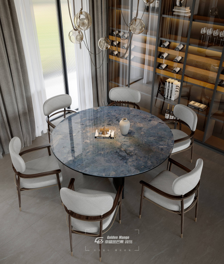 往前几步,便是餐厅的地盘。一张圆形餐桌稳稳当当地占据着空间的焦点,光滑的表面反射着头顶吊灯洒下的光,像是在邀请你:来呀,一起围坐,分享一顿美食。而那些围坐在它周围的餐椅,线条简约得刚刚好,米白色的软垫又添了几分温柔。